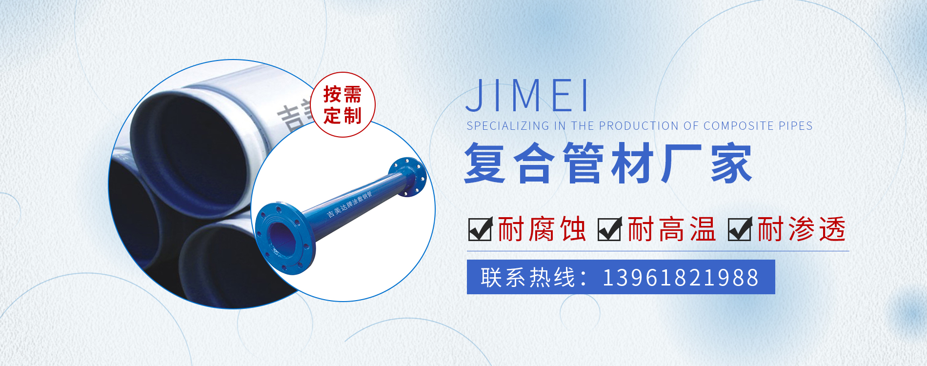 常州市吉美管業(yè)有限公司,是一家專業(yè)生產(chǎn)復合管材的生產(chǎn)企業(yè)。 依靠公司技術(shù)力量和多年的實踐經(jīng)驗,可年生產(chǎn)內(nèi)襯塑、內(nèi)襯外涂、內(nèi)外涂PE、PEX、EP復合管道以及工業(yè)防腐管道等多種復合管材及管件10萬噸的生產(chǎn)能力。